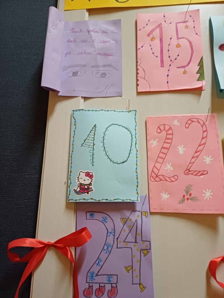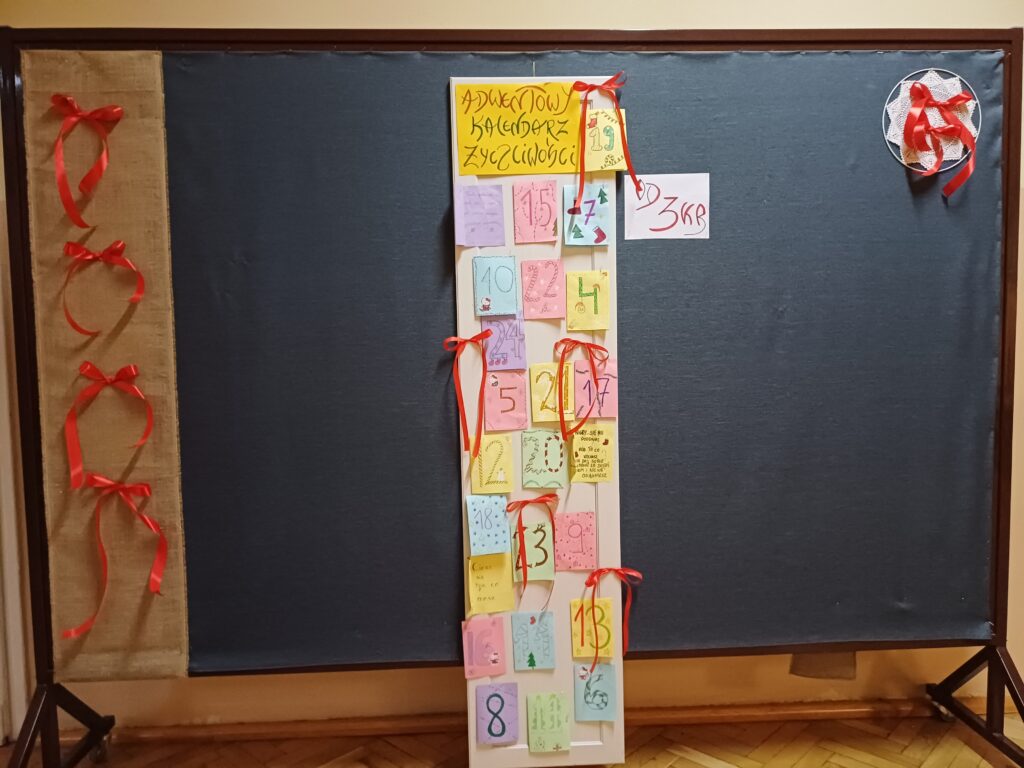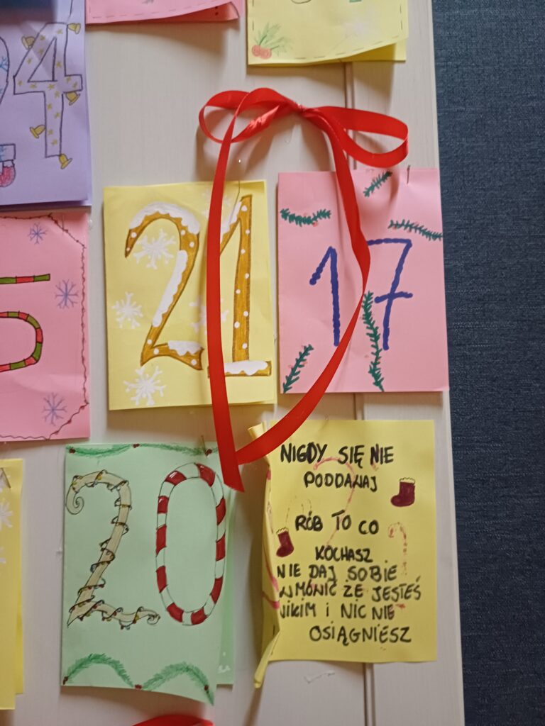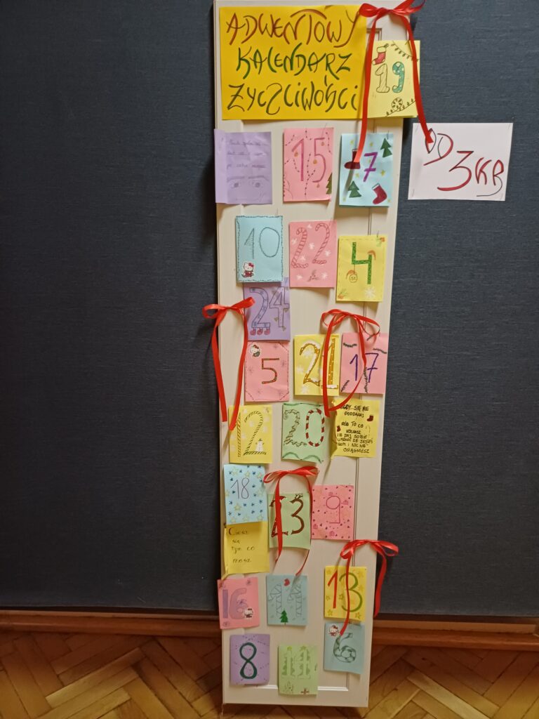 Tradycyjnie ma 24 okienka lub komórki, w których ukryte są drobne niespodzianki, takie jak czekoladki, kosmetyki, zabawki lub… tak jak to zrobiły uczennice z klasy 3KR Branżowej szkoły I stopnia wraz z wychowawczynią Panią Anną Żywocką-Streker, mają postać KARTEK DOBRYCH SŁÓW na każdy dzień.