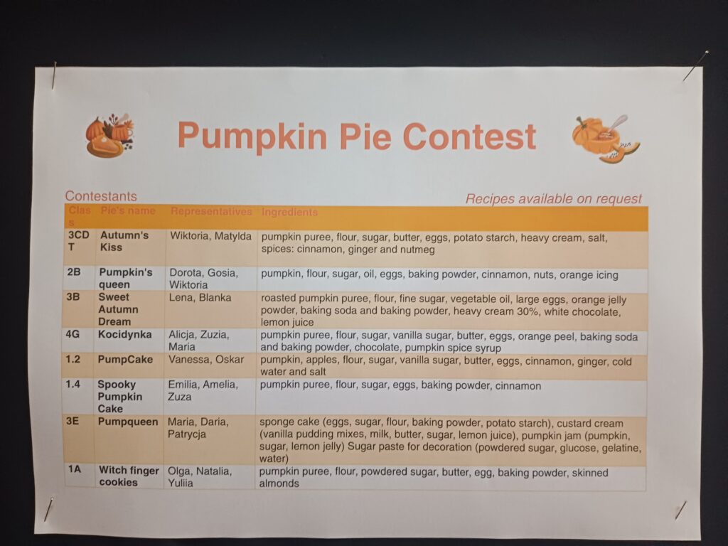 1. miejsce zajęła klasa 3E z ciastem „Pumpqueen”, 2. miejsce zajęła klasa 4G z ciastem „Kocidynka”, 3. miejsce klasa 3CD z ciastem Autumn’s Kiss. Wyróżnione klasy to 3B -”Sweet Autumn Dream”, 1.2 – „Pumpcake”, 3.2 – Sweet Pumpkin, 1A- „Witch finger cookies”